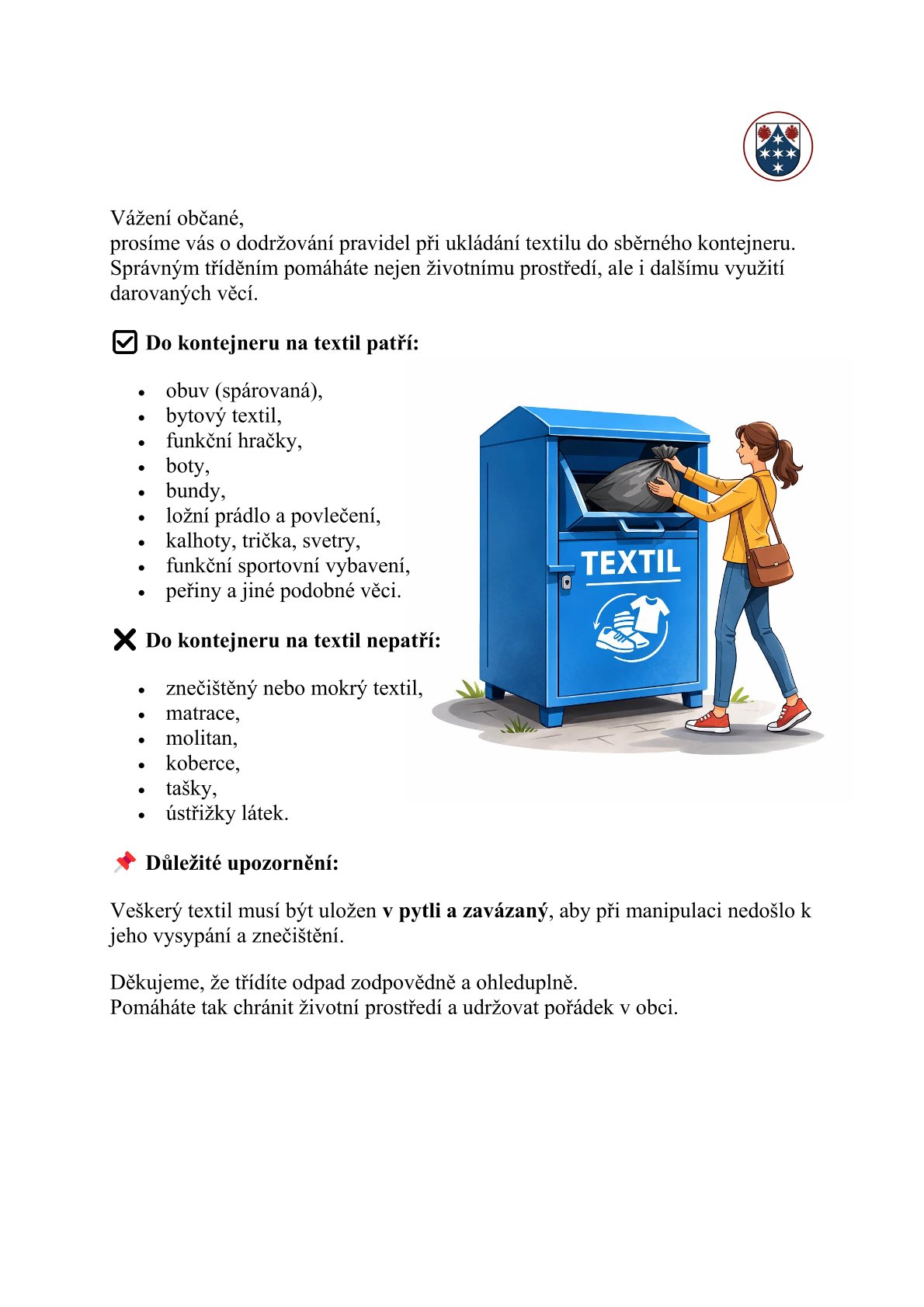 Informujeme občany, že od 23.5.2019 je na návsi trvale umístěn kontejner na textil Diecézní charity Brno. Pokud se rozhodneme ze svého šatníku něco darovat, důležité je, aby všechno oblečení či boty, co do kontejneru vhazujeme, byly v taškách nebo pytlích z důvodu snadnější manipulace při ručním výběru kontejneru a ochraně proti vlhkosti. Textil nesmí být mokrý nebo vlhký, už vůbec ne nějak biologicky či chemicky znečištěný či plesnivý.
